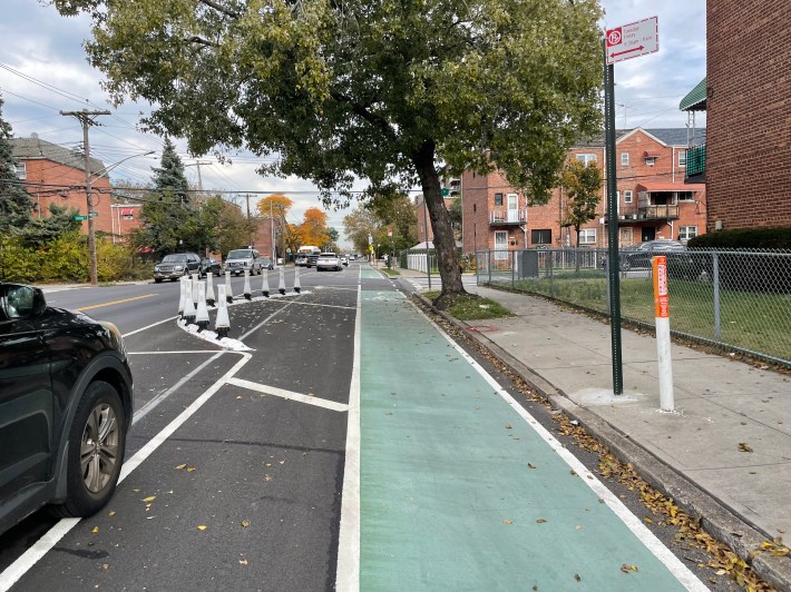 In East New York, Cozine Avenue and Wortman Avenue, a pair of mile-plus streets that average almost 80 crashes a year despite their short lengths recently got a safety-first upgrade with the installation of protected bike lanes — as seen below on Cozine and Schenk Avenue — in a neighborhood that lacked (and still lacks) safe bike infrastructure.