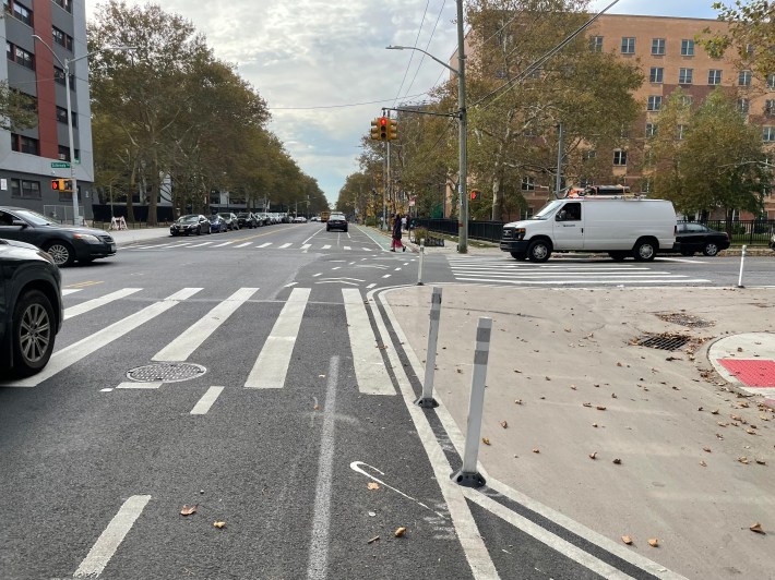 There were also a handful of more forceful daylighting efforts in the project — specifically the installation of curved rows of plastic bollards jutting out at some intersections to force drivers to make wider turns and not cut across the bike lane quickly.