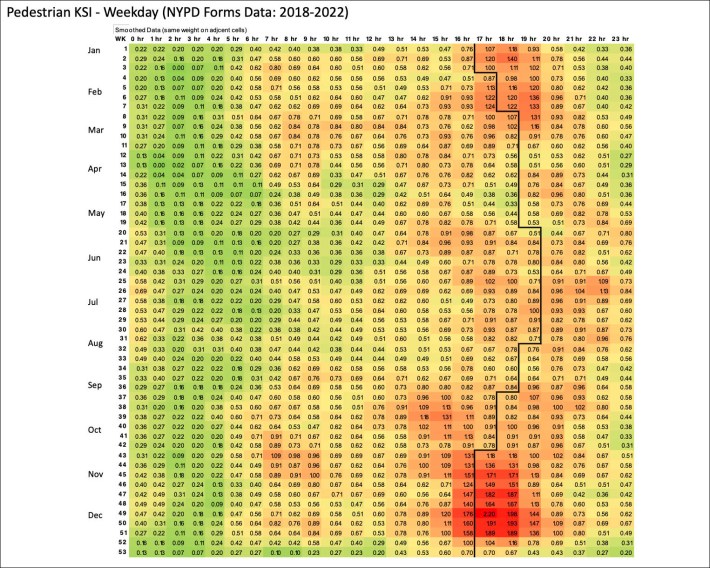 The chart shows significantly less red — representing severe and fatal crashes — during the autumn evening hours than it showed when DOT first launched its “Dusk and Darkness” education and enforcement initiative in 2016.