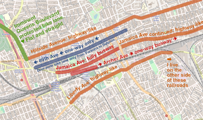 If I’m coming from Queens Boulevard or Brooklyn, my preferred route, Jamaica Avenue, is now a busway the entire way, where most cars and bikes are technically prohibited. Liberty and Hillside Avenues are basically highways and too treacherous for my personal risk level; 89th Avenue is one-way in the opposite direction; and the street grid doesn’t offer me other short and direct options.