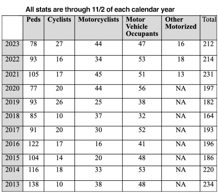 Let’s go with the good news first: Pedestrian deaths through the first nine months of the year are at an all-time low (except for the pandemic year when there were very few pedestrians). The Adams administration has been touting that number repeatedly over the last few weeks, and Department of Transportation Commissioner Ydanis Rodriguez said it again on Thursday, so let’s repeat it: Fatalities for people on foot are down this year, as you can see from this DOT chart: