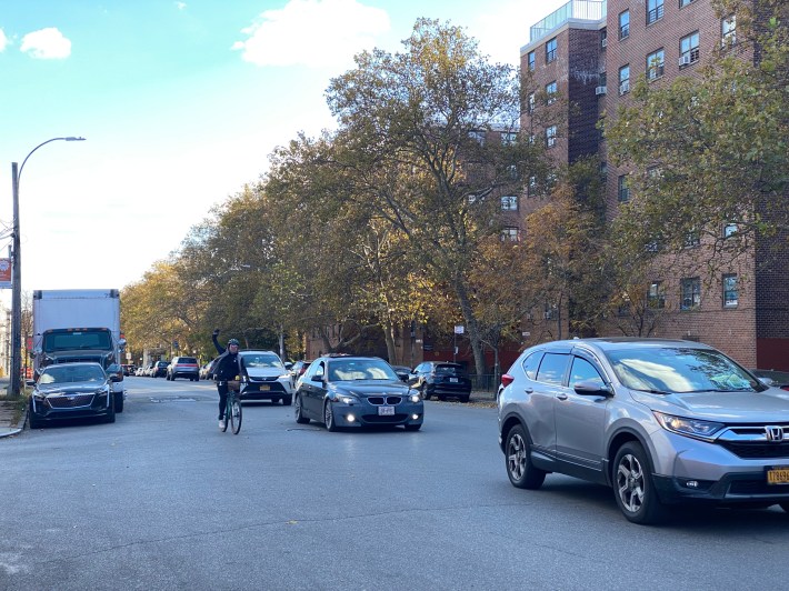 Some sections of the road pinch down to just 30 feet wide, making it challenging to carve out enough space for all modes of transportation, while other stretches, especially next to the Cooper Park public housing complex, become much wider, providing plenty of room to reallocate street space for bikes.