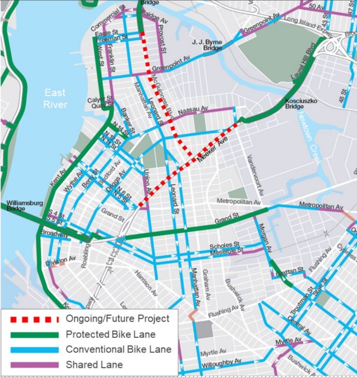A safe bike path would link up to incoming protected bike lanes DOT is working on at Meeker Avenue below the Brooklyn-Queens Expressway, and on McGuinness Boulevard — if the Adams administration doesn’t bail even further on the latter road’s redesign after already caving to local business interests and watering down that revamp.