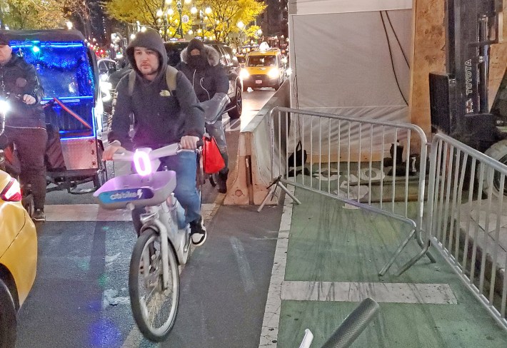 Then, a few days later, our sometime friend, sometime bitter rival Lincoln Anderson of the scrappy Village Sun sent over pictures of cyclists thrown into traffic in dangerous Herald Square just because Macy’s doesn’t want to provide the legally required protected detour on the bike lane in front of the once-famous-but-now-neutered-by-online-shopping department store:
