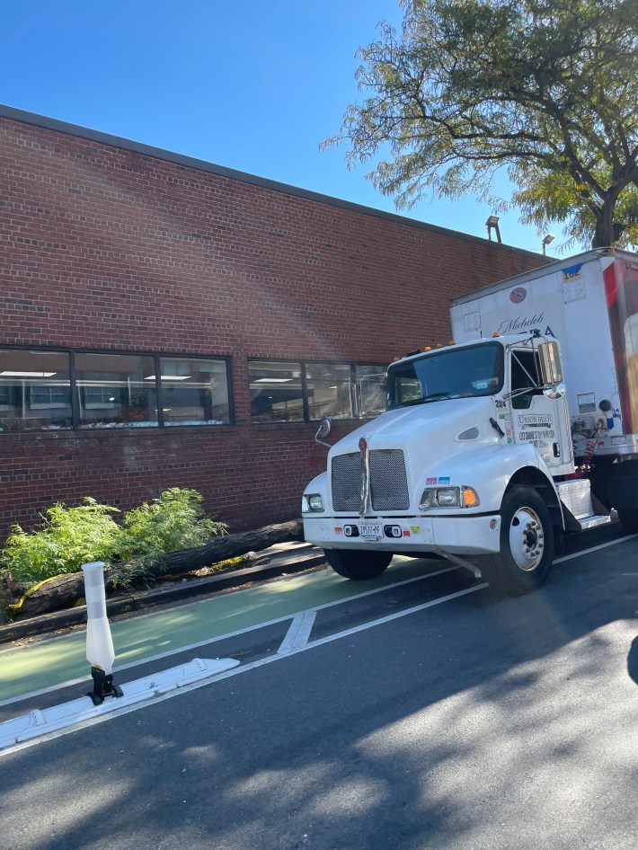 Recently-painted curbside bike lanes on the section of McGuinness north of Calyer Street experience “near constant” illegal car and truck parking — while parking spots meant to separate cars from cyclists and pedestrians sit empty, leaving them unprotected, the pols said.