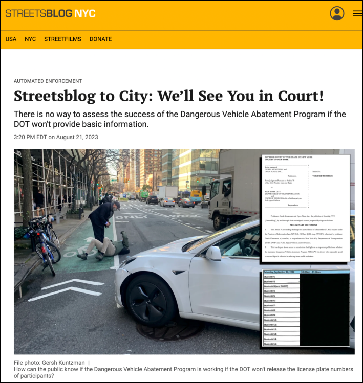 When the DOT refused to give us the plate numbers, we sued — and our court papers filed by Heather Murray of the Cornell Law School First Amendment Clinic rang with righteous indignation: “This is a dispute about access to records that shed light on an important public issue: whether the Dangerous Vehicle Abatement Program … is effective in reducing future traffic violations. … DOT failed to articulate particularized and specific justification for denying [Streetsblog] access to the license plate numbers.”
