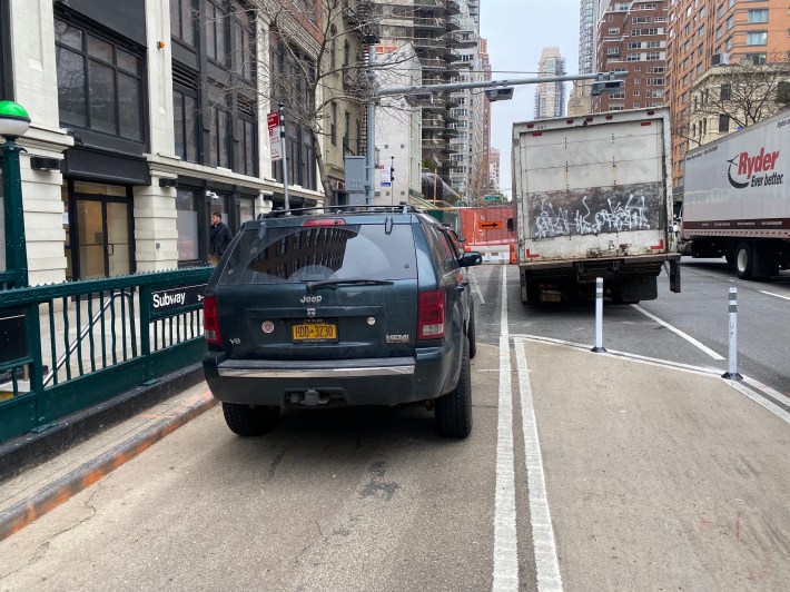 The bike lane was unfortunately already blocked by construction by the second block north of E. 60th Street, and the contractors failed to set up the legally required safe detour. A driver parked in what would have been the bike lane had 72 violations since 2016, including five speeding tickets, two red light tickets, and dozens of parking violations.