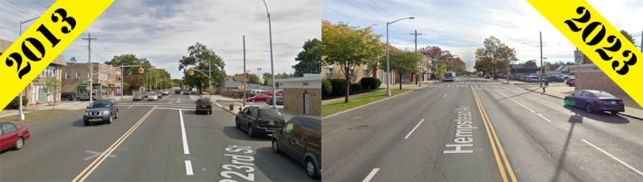 Hempstead Avenue is a very dangerous stretch of roadway that connects Belmont Park to Jamaica Avenue. In just the short stretch of the roadway west of the Cross Island Parkway, there have been 71 crashes so far this year, injuring 44 people, according to city stats. The crashes, in part, are a result of a road design that has not been made safer in more than a decade, as the Google photos below show: