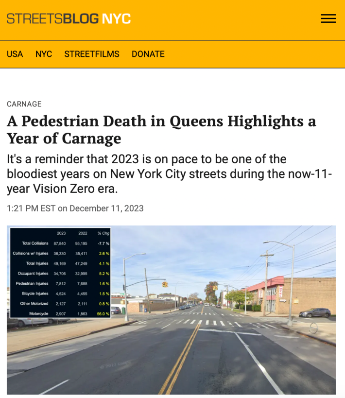 The administration also celebrated being on track for an historic low in pedestrian fatalities this year, but overall crash deaths are among the highest in a decade, with a surge in cyclist deaths this year, and injuries are up across the board too, according to the latest police data.