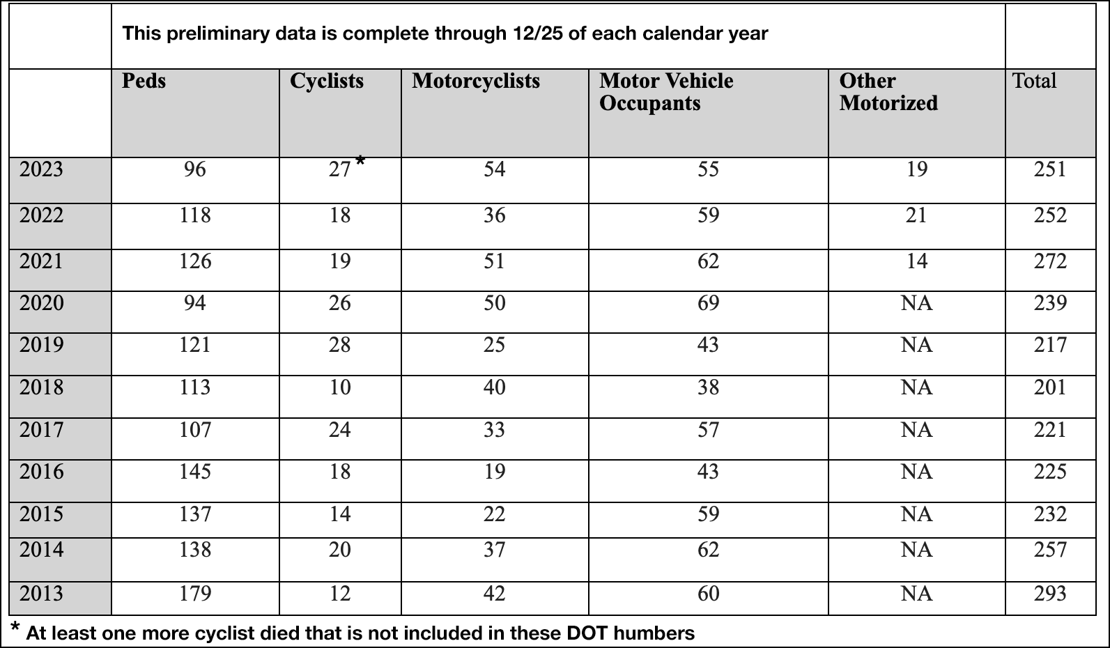 DOT has touted a decline in pedestrian fatalities against the backdrop of rising numbers nationally, but there were 251 overall road fatalities in the five boroughs, just shy of the 252 in 2022, according to the latest data through Dec. 25. Ninety-six of those were pedestrians and cyclist deaths soared to 28 this year, the second-highest tally in a decade.