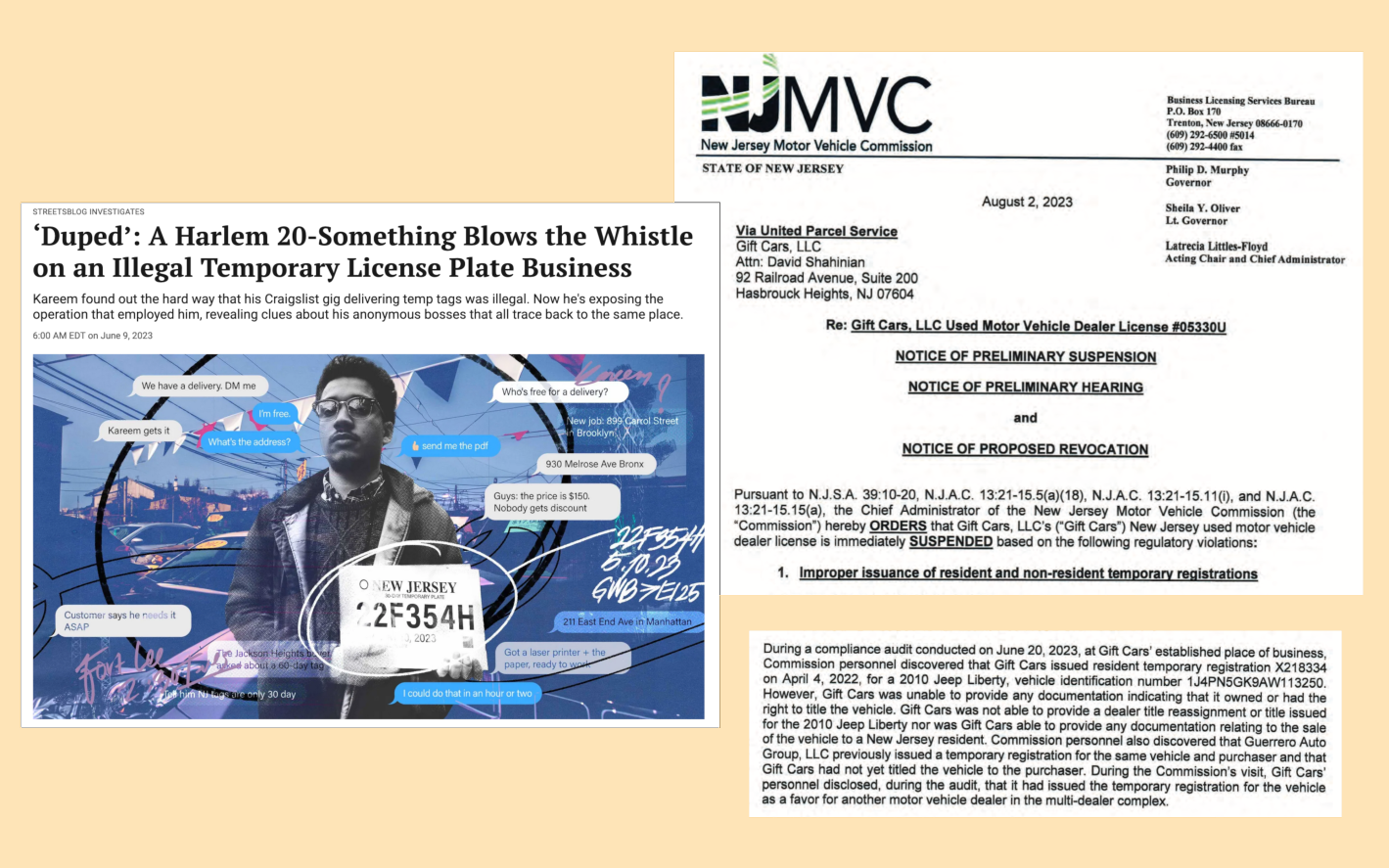 Some of the shuttered dealerships were identified as possible temp tag fraudsters in Streetsblog's series. That includes Gift Cars, a New Jersey dealership whose owners were the subject of a Streetsblog investigation in June that revealed connections between the business and an illegal temp tag sales operation in New Jersey and New York. Eleven days after that story's publication, the MVC audited Gift Cars and found evidence of temp tag fraud, the records show. The agency suspended Gift Cars' license in August and proposed a $10,000 fine for the temp tag violations.
