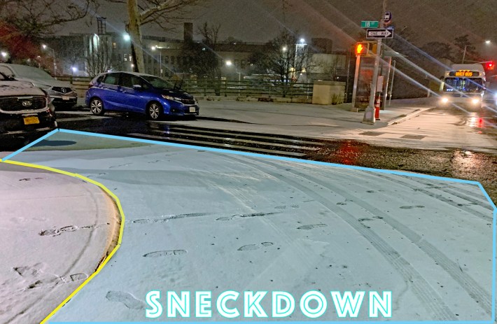 In any event, even a small amount of snow shows us how little space automobiles need — and how much more of our precious public space we give them. You can see it in the “sneckdown,” as Streetfilms auteur Clarence Eckerson is always saying.