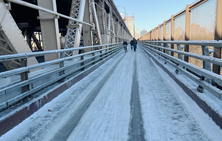 A spokesperson for the DOT said crews had been “clearing the bike and pedestrian paths on the city’s East River bridges beginning yesterday and into the overnight hours,” and were back out on Wednesday “continuing that work to keep these spaces clear for cyclists and pedestrians.”