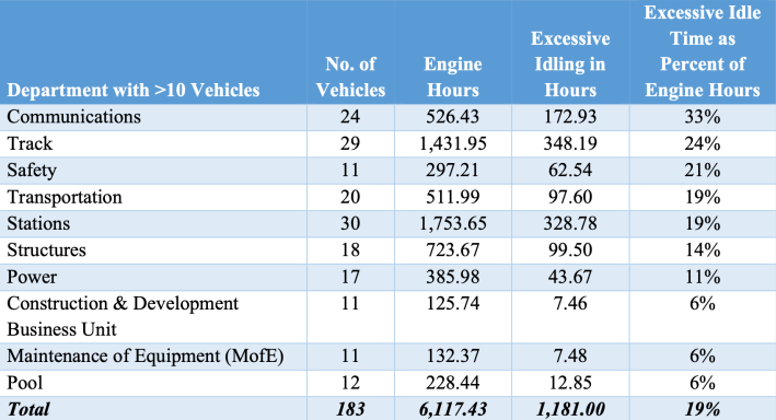 Auditors working for the Office of the MTA Inspector General reviewed the vehicle monitoring system, called FleetTrack, for both the Long Island Rail Road and NYC Transit during different periods in 2023 and found that LIRR vehicles idled roughly 19 percent of the time, and that 64 percent of NYC Transit’s 417 vehicles idled excessively for over 5,000 hours.
