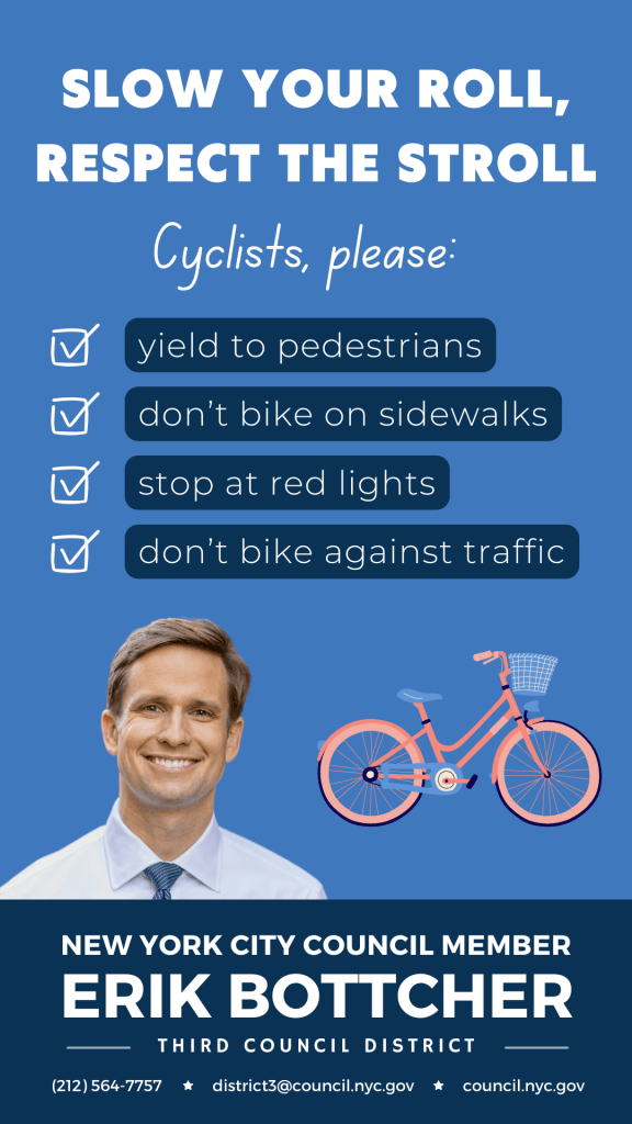 The new campaign, “Slow Your Roll, Respect The Stroll,” will kick off this week on LinkNYC kiosks throughout Bottcher’s Hudson Square, West Village, Chelsea, Hells Kitchen, and Times Square district. Bottcher acknowledged that the biggest threat to New Yorkers when it comes to traffic violence is reckless drivers behind the wheel of multi-ton cars and trucks, but added that his constituents consistently bring up cyclists as their principal fear.