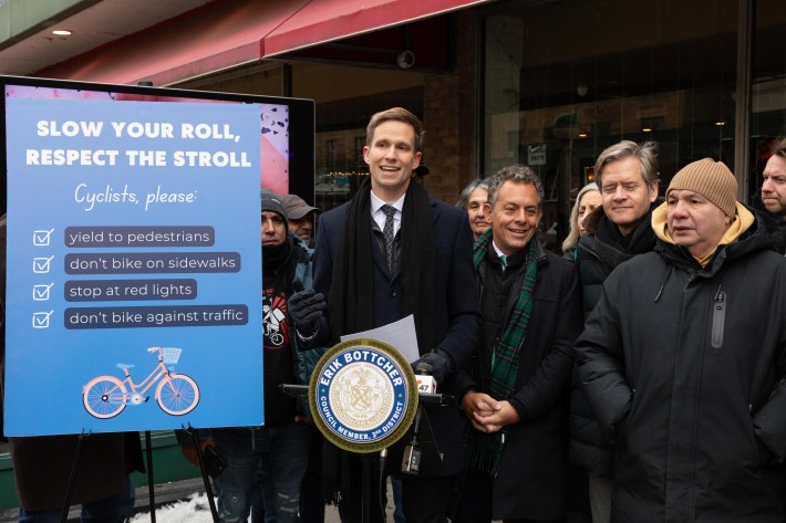 Manhattan City Council Member Erik Bottcher on Thursday unveiled a new public awareness campaign targeted at cyclists, asking them to be more mindful of pedestrians by stopping at red lights and refraining from biking against traffic and on the sidewalk.