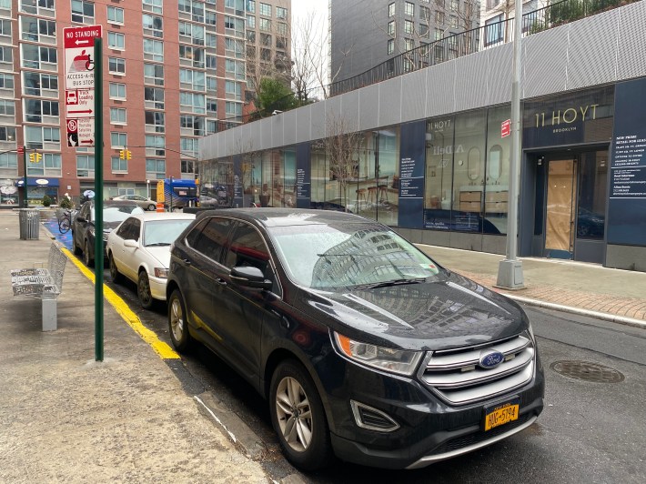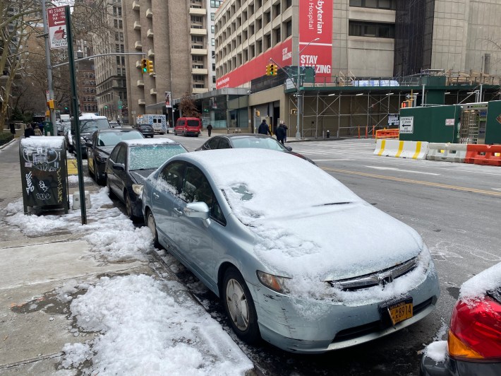 A sedan with city plates was parked in the spot twice when Streetsblog checked over the last week, and it once had its windshield covered in snow days after the most recent snowfall, indicating it likely doesn’t move much.