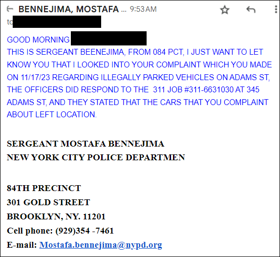 Unfortunately, the investigation was lacking. Sergeant Mostafa Bennejima neglected to consider my photo evidence and relied on demonstrably false statements from his colleagues that the “cars that you complaint [sic] about left the location.” Video from day of showed the offending vehicles did not move even after NYPD officers declared the issue resolved and closed the complaint.