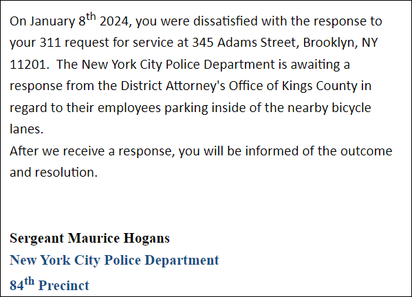 A separate investigation — into a complaint filed on Jan. 8, 2024 — led Sgt. Maurice Hogans to contact the Brooklyn District Attorney’s office about their employee parking in the bicycle lane. It’s unclear what they’re asking — it’s illegal to park a personal vehicle in the bike lane, even if you work for Eric Gonzalez.