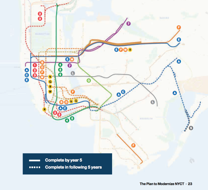 Fast Forward was merely a blueprint, but officials turned its goals into specific commitments in the 2020-2024 capital plan. Officials pledged to use funding from the state, feds and congestion tolls to upgrade signals on several lines encompassing a huge chunk of the subway network: