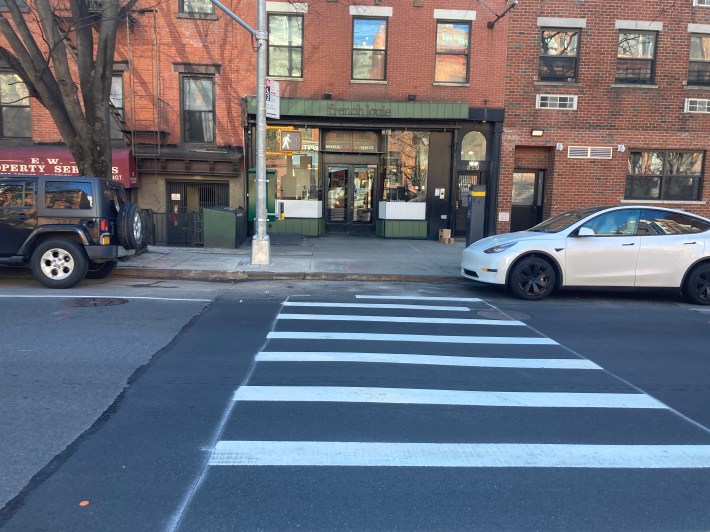 And as of Monday afternoon, when Streetsblog visited the thoroughfare, crews had only applied paint to one of the crosswalks — between Smith and Hoyt streets.