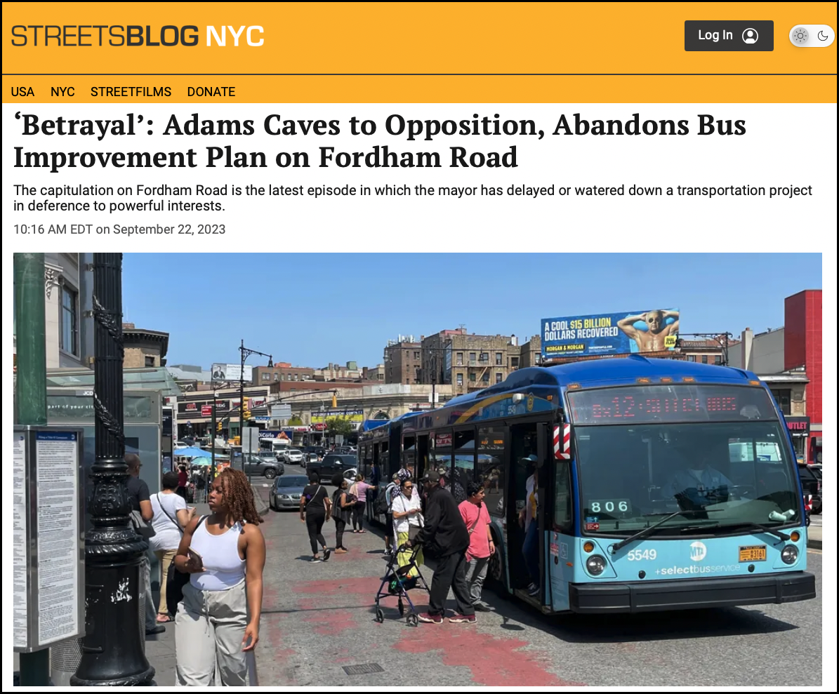 And on Fordham Road, the DOT’s years-long outreach revealed that bus riders wanted aggressive bus priority — but the Adams administration bowed to a small number of institutional and business opponents, which left bus riders where they’ve been since 2008.
