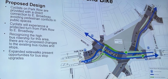 In workshops over the summer, city officials did show local electeds and community groups schematics of a major change to the neighborhood that includes a larger plaza on the western side of the Bowery, straighter intersections, shortened pedestrian crossings, and better possible bike connections, which are currently non-existent north of Park Row.