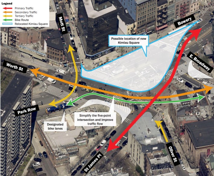 DOT says the realignment would straighten east-west travel routes between East Broadway and Worth Street, and north-south routes between St. James Place and the Bowery (above). Currently, car and truck traffic has to snake around Kimlau Square.