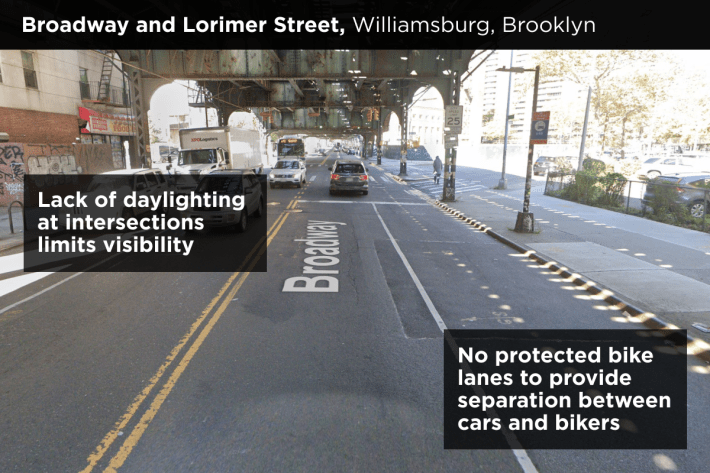 In a statement on the crash, Transportation Alternatives pointed out that Broadway does not have a bike lane, and that the intersection where the crash occurred lacks daylighting measures. There have been 15 crashes just at the intersection of Broadway and Lorimer Street between January 2021 and December 2023, that injured four cyclists, one pedestrian and four motorists.
