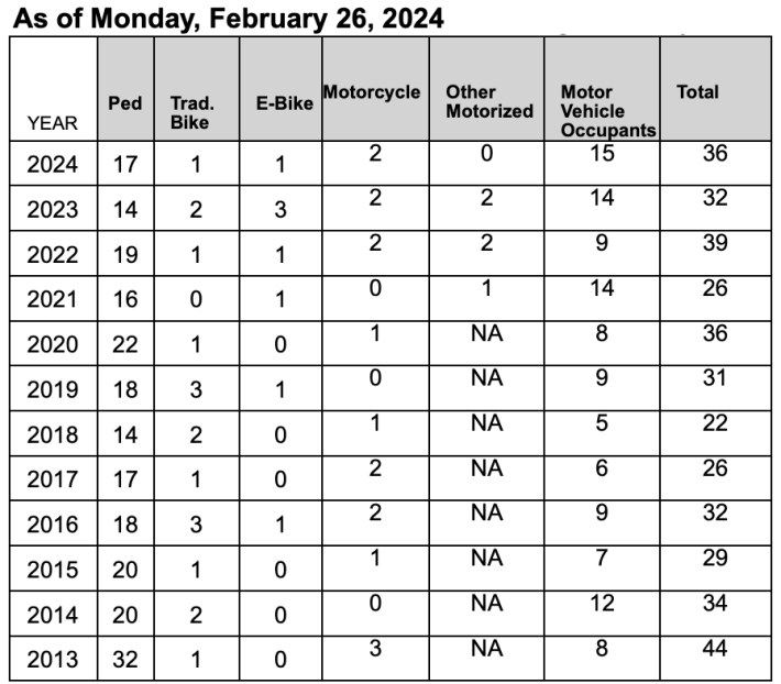 According to the DOT, this has already been an exceptionally bloody year, with 36 traffic fatalities through Feb. 26, up from 32 during the same period last year.