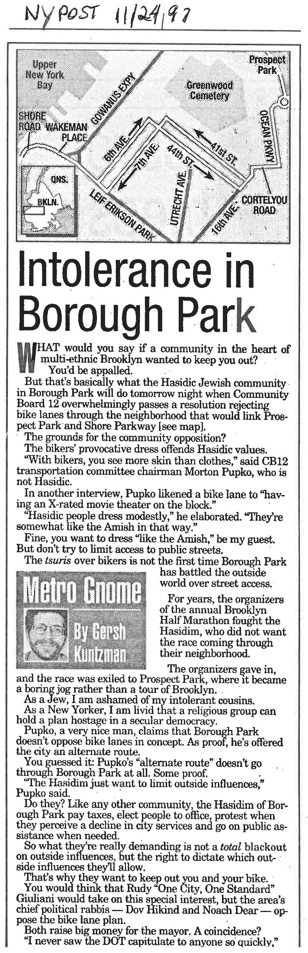 At the time, then-Community Board 12 Transportation Committee Chairman Morton Pupko told me that having people bike through the neighborhood was like “having an X-rated movie theater on the block.” Then-Mayor Rudy Giuliani capitulated to the powerful voting bloc.