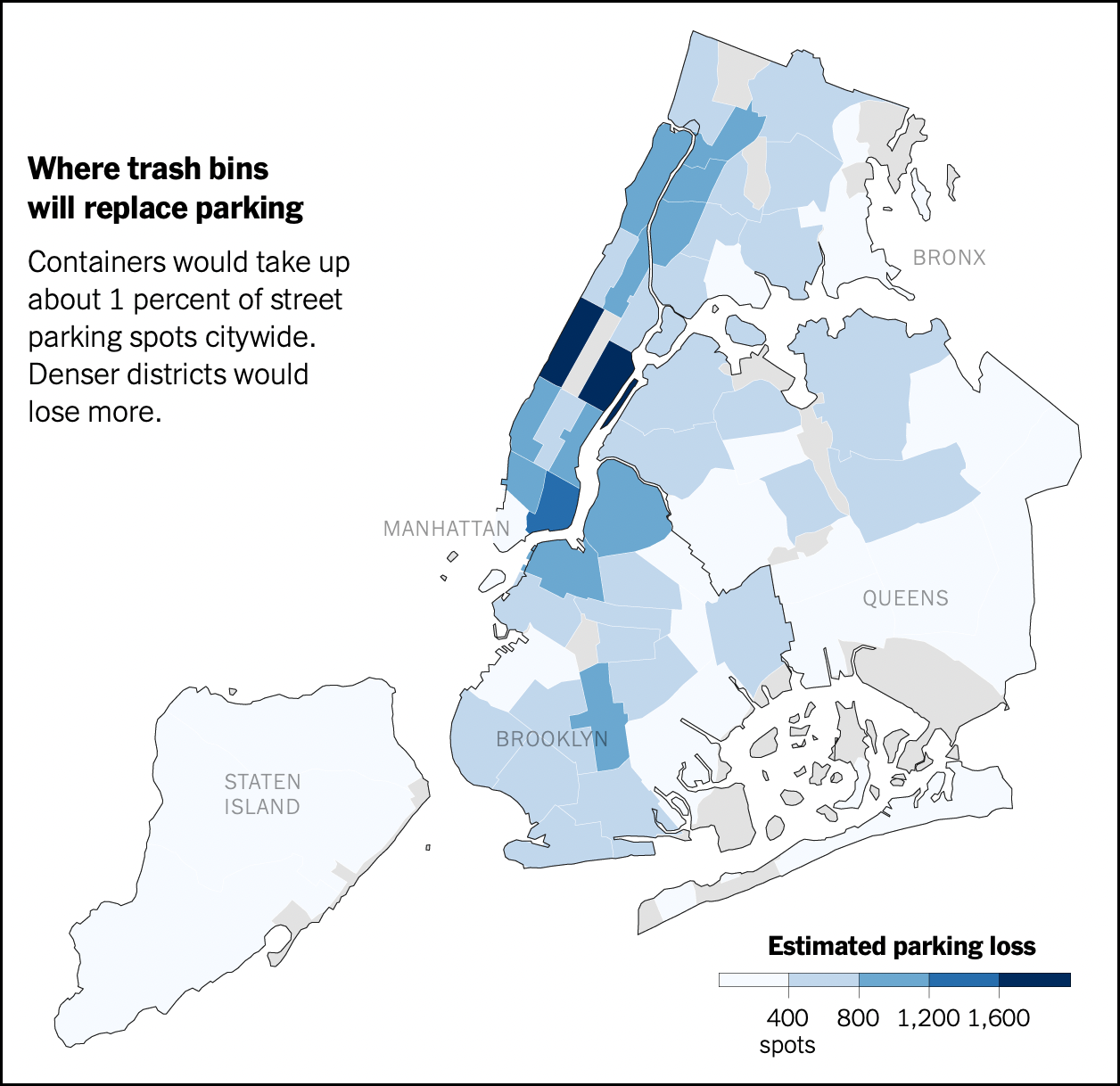 “The Sanitation Department estimates that this plan would take up 22,000 to 34,000 parking spaces — about 1 percent of the city’s total on-street parking,” the paper reported.