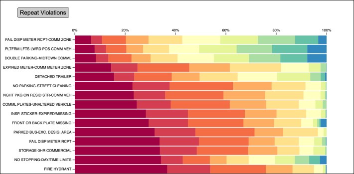 The top repeat offense was parking illegally in a metered spot in a commercial zone — nearly 94 percent of those summonses went to drivers who had already been ticketed for that before.