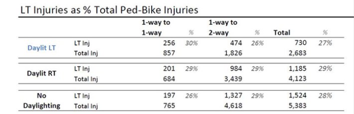 The table showed there was a slightly higher percentage of bike and pedestrian injuries at crossings of two one-way streets that banned parking at the corner — albeit without a physical obstruction — and the agency also at the time admitted it has never done a “comprehensive analysis of daylighting safety.”