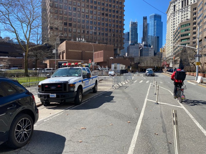 On Monday, metal barricades lined the sidewalk. Instead of occupying legal spots, dozens of police cars sat smack dab in the middle of the bike lane.