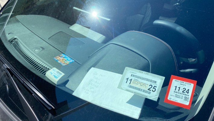 Vehicles were either marked police cruisers or had parking placards or other police paraphernalia in their dashboards to avoid parking tickets. One vehicle had a police union “courtesy card” and a handwritten note saying, “Do not have parking permit yet. Please don’t tow.” (The parking perp may not have had his car long enough to get a placard, but he’s already racked up three camera-issued tickets since December.)