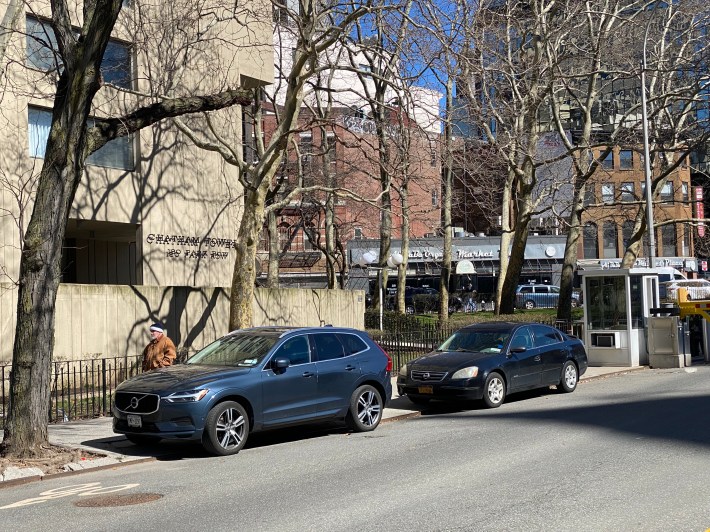 The street south of Worth Street recently shed some of its Checkpoint Charlie-like infrastructure, but those gains for public space came undone after cops dumped their cars on the corridor — to their neighbors’ chagrin.