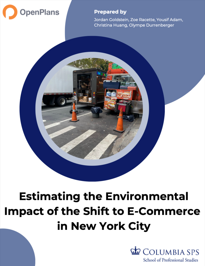 Commissioned by Open Plans, the Columbia’s School for Professional Studies report, “Estimating the Environmental Impact of the Shift to E-Commerce in New York City,” found that a single double-parked delivery truck on average affects 43 cars, which not only adds .06 grams of particulate matter (PM2.5) to the air, but delays all the drivers more than two minutes. And in this city, time is indeed money; those delays cost the city over $243 million every year, the report estimates.