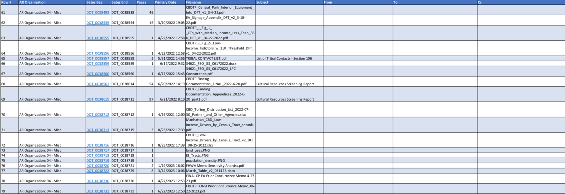 That administrative record is so big, in fact, that the FHWA was exempted from having to file the entire thing online, and was instead able to file a record summarizing the entire thing. The summary is a 102-page PDF that lists, in date order, correspondences, studies and public comment on every burp and spit of congestion pricing.