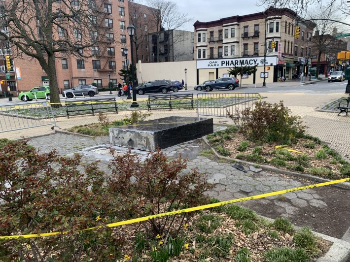 Speaking of other things that the city’s squadron of press officers doesn’t want to discuss, I learned on March 29 that the war memorial in the center of a Park Slope traffic circle had again been knocked over by a car driver. It was almost two years to the day since the same thing happened in 2022, so I sent the new picture over to the NYPD: