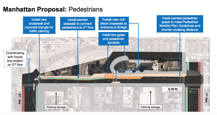 On the Manhattan side, the north side of East 59th Street between First and Second avenues will get a painted pedestrian bumpout, a painted sidewalk connected to Second Ave and a short midblock crossing near the entrance to the bridge’s forthcoming pedestrian path.