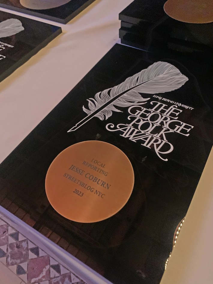 We would be remiss if we didn’t offer some photos and copy about Friday’s George Polk Awards ceremony, where our investigative reporter Jesse Coburn picked up the prize for local reporting for his much-honored “Ghost Tags” series on scofflaw drivers.