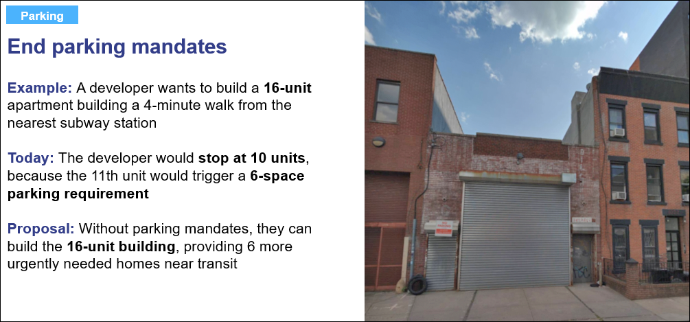 But Open Plans and other pro-housing groups have been preemptively championing another vital element of City of Yes: The end of a 62-year-old requirement that developers build off-street parking spaces even if potential customers aren’t asking for them or the development is so close to transit that the requirement itself is counter-productive to the city’s larger sustainability goals.