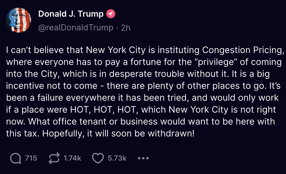 Congestion pricing has entered the Donald Trump social media universe.