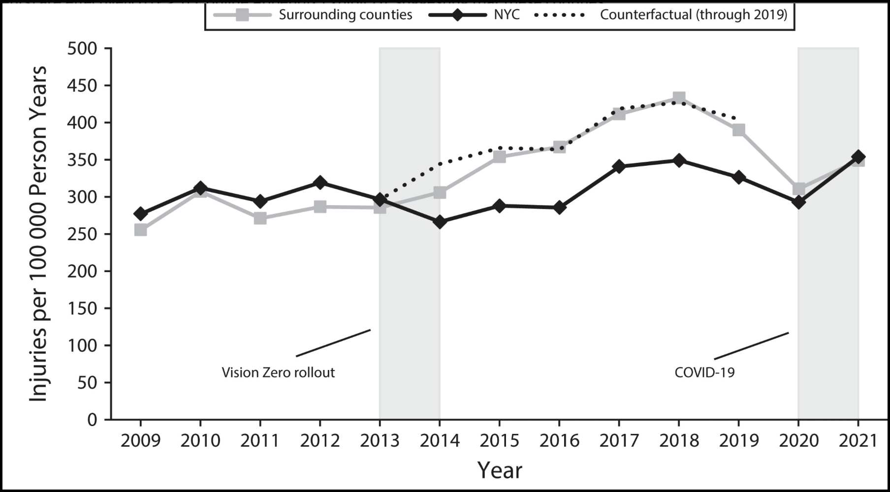 Vision Zero reduced crashes by a rate of 77.5 per 100,000 people compared to the non-Vision Zero trendline — saving Medicaid roughly $90.8 million between 2014 and 2018. But the positive trend in the city reversed during the pandemic — when the city and its car-dependent suburbs resumed their more or less aligned pre-Vision Zero traffic injury rates, according to researchers Kacie Dragon and Sherry Giled, who published their findings in the American Journal of Public Health.