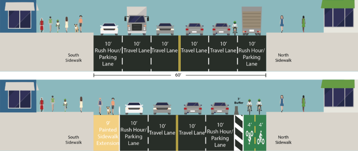 The bike lanes would be protected on each side of the street by a three-foot buffer and eight-foot parking lane. Eleven-foot-wide painted islands would protected cyclists at intersections, while shortening pedestrian crossing distances and encouraging drivers to make slower turns.