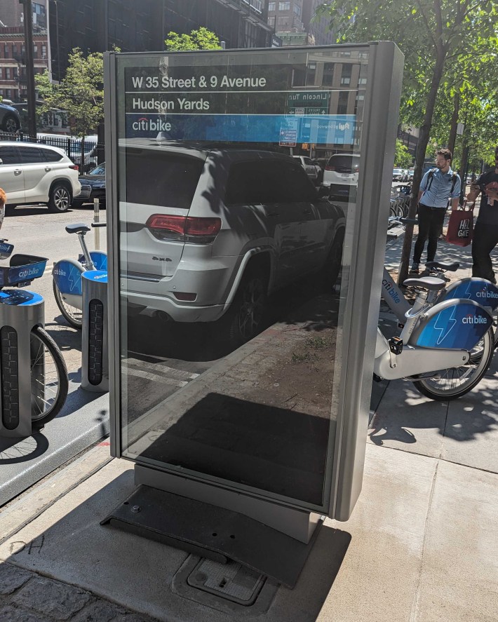 The inaugural electrification effort consists of three docks on the sidewalk at West 35th Street and Ninth Avenue in Manhattan — even though the rest of the docking station is on the street — plus an entire electrified station, also on the sidewalk, at Meserole and Manhattan avenues in Greenpoint.
