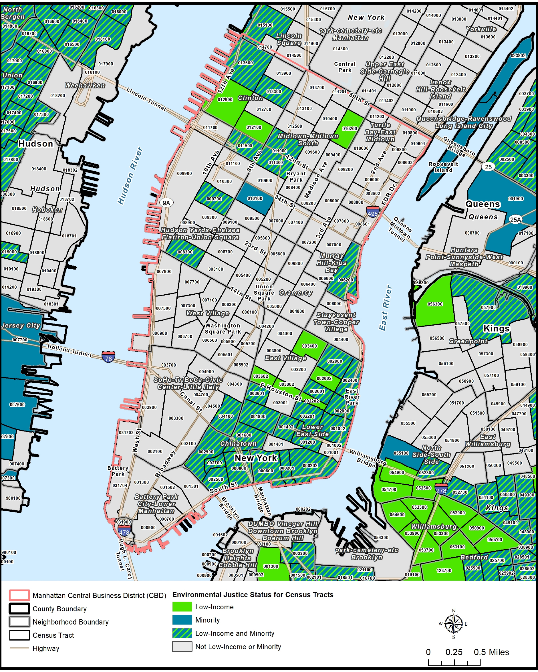 Most of the areas next to the FDR Drive between the Brooklyn Bridge and 10th Street, are EJAs, as the MTA’s own map shows: