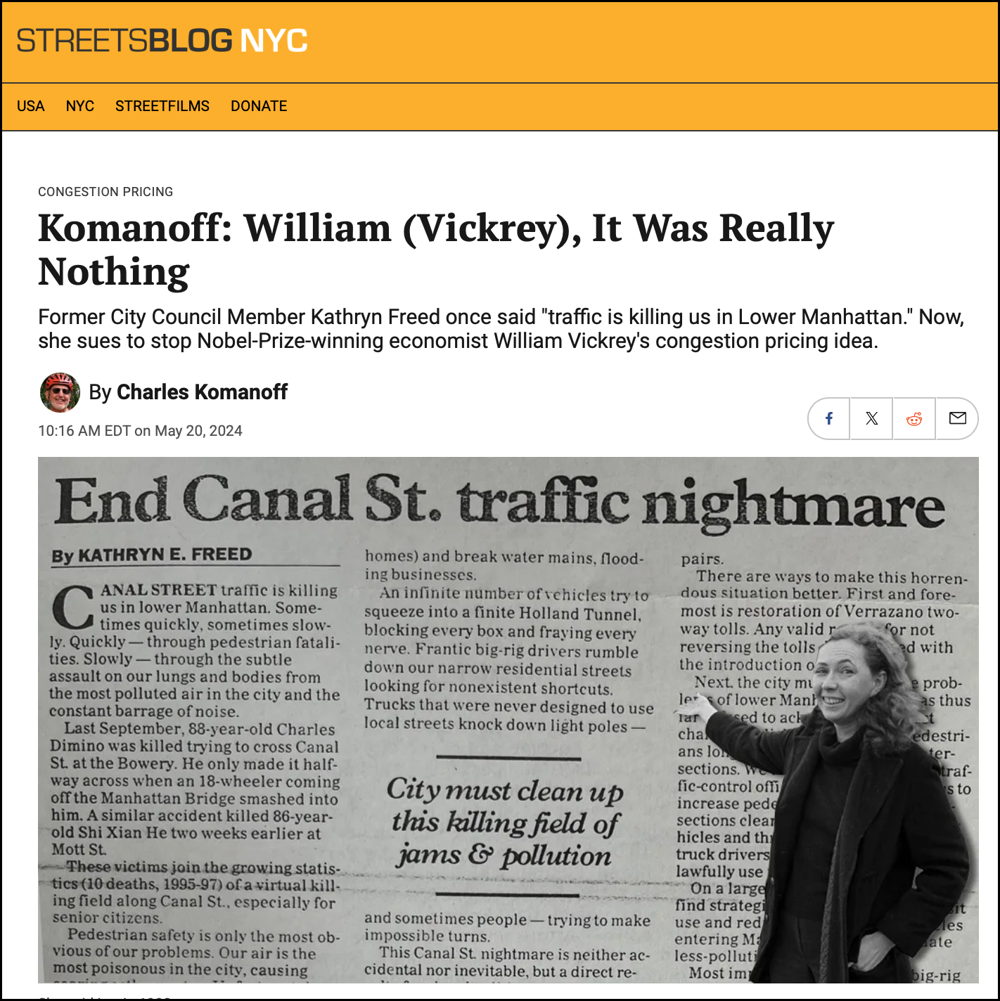 On Monday, Streetsblog published an opinion piece by longtime contributor and congestion pricing expert Charles Komanoff that called out former Council Member Kathryn Freed for hypocrisy because she is suing to get an entirely new environmental review of congestion pricing that will halt the toll before its June 30 start. In the interest of fair play, we present Freed’s rebuttal (with some necessary fact-checking).