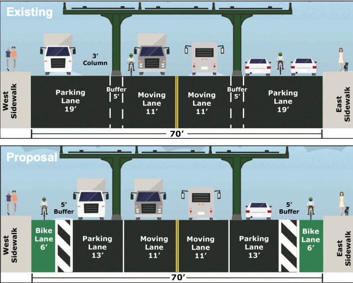 DOT’s redesign — already implemented from E. 241st Street to Burke Avenue — transforms the street’s existing unruly 19-foot-wide parking/moving lanes on the outside of the elevated subway columns into 6-foot bike lanes protected from traffic by a 5-foot buffer and 13-foot parking plane.